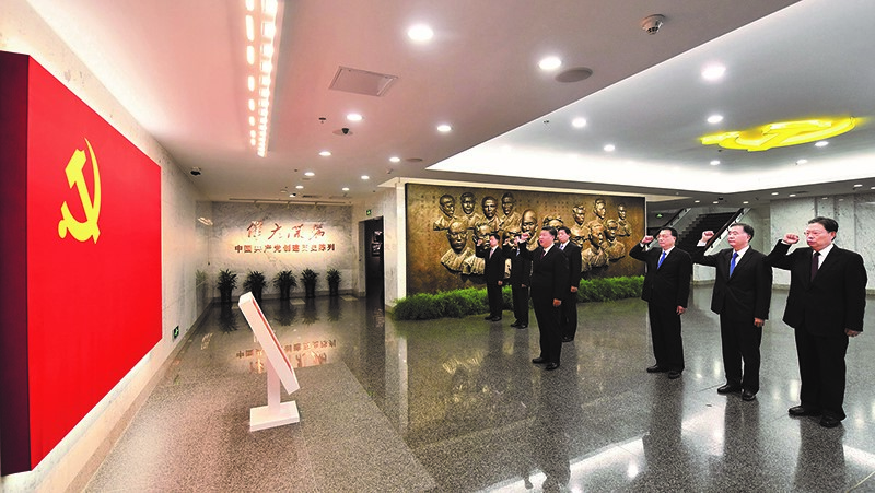 2017年10月31日,中共中央总书记、国家主席、中央军委主席习近平带领中共中央政治局常委李克强、栗战书、汪洋、王沪宁、赵乐际、韩正,瞻仰上海中共一大会址和浙江嘉兴南湖红船。这是31日上午,在上海中共一大会址纪念馆,习近平带领其他中共中央政治局常委同志一起重温入党誓词。 新华社记者 李涛/摄